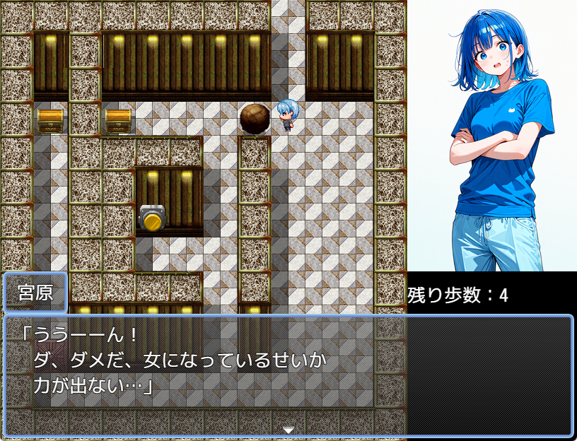 その上、容姿が変わるだけではなくできる行動にも影響が出てしまうことがあります。早い段階で重いものを動かすことはできるけど、歩数を重ねて女体化してしまうと押せなくなってしまうといった要素もあり、ネタとしてTSF的な要素を入れ込んでいるだけでなく仕掛けにも反映している点は非常に面白いです。